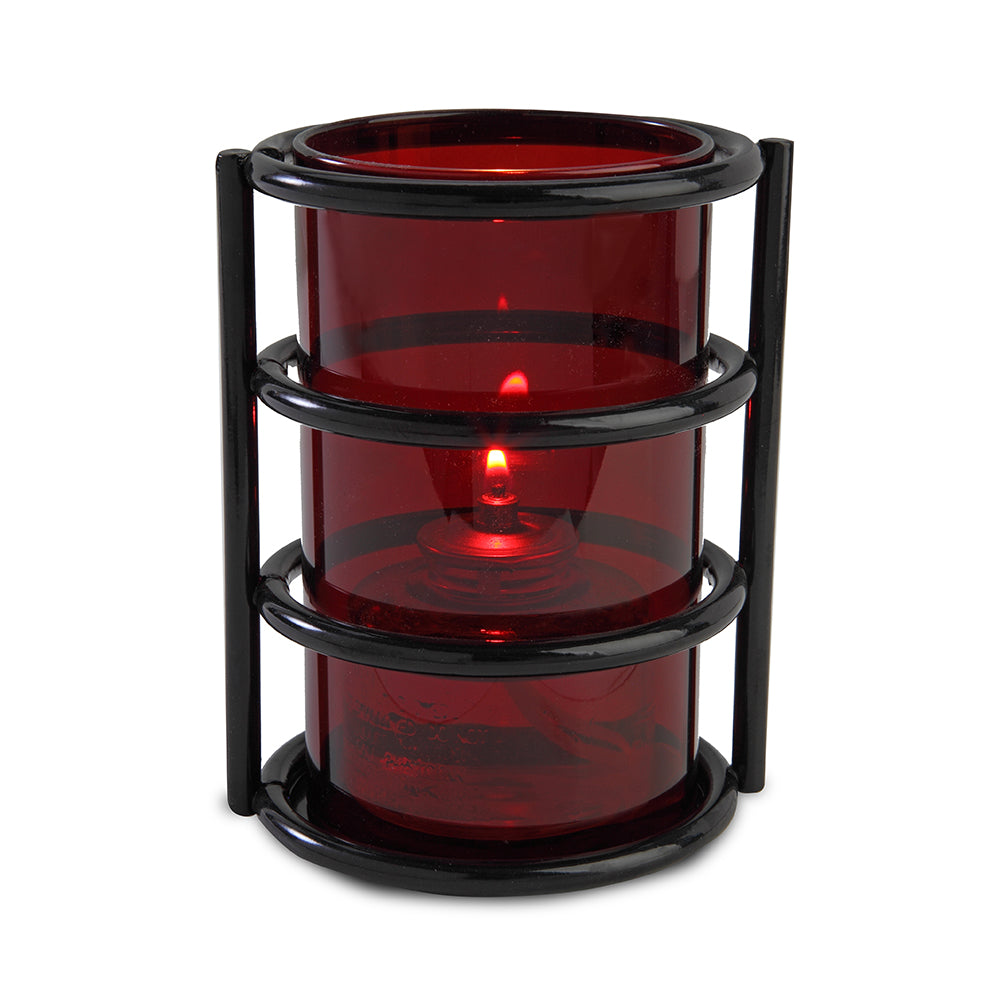A contemporary styled black base paired with a red, glass cylinder offers a bold presence.