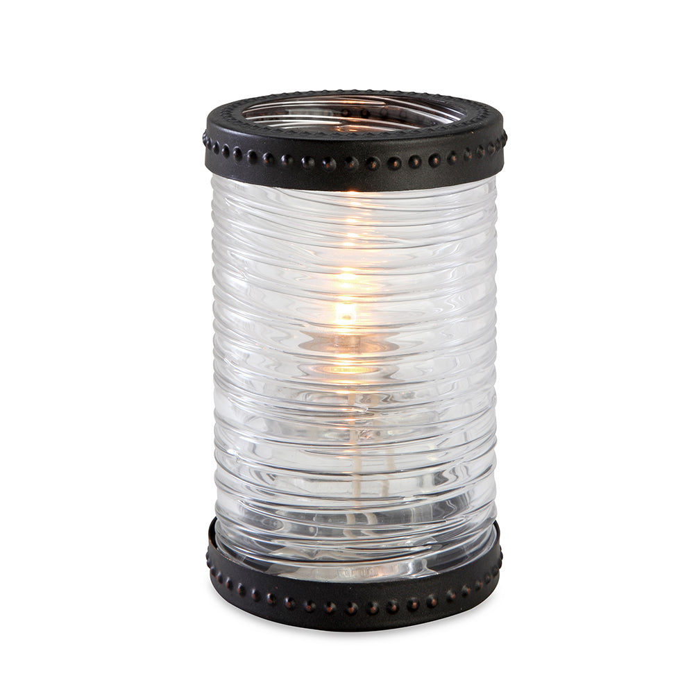 Industrial-inspired cylindrical design with a crackle glass cylinder paired with a metal beaded rim.