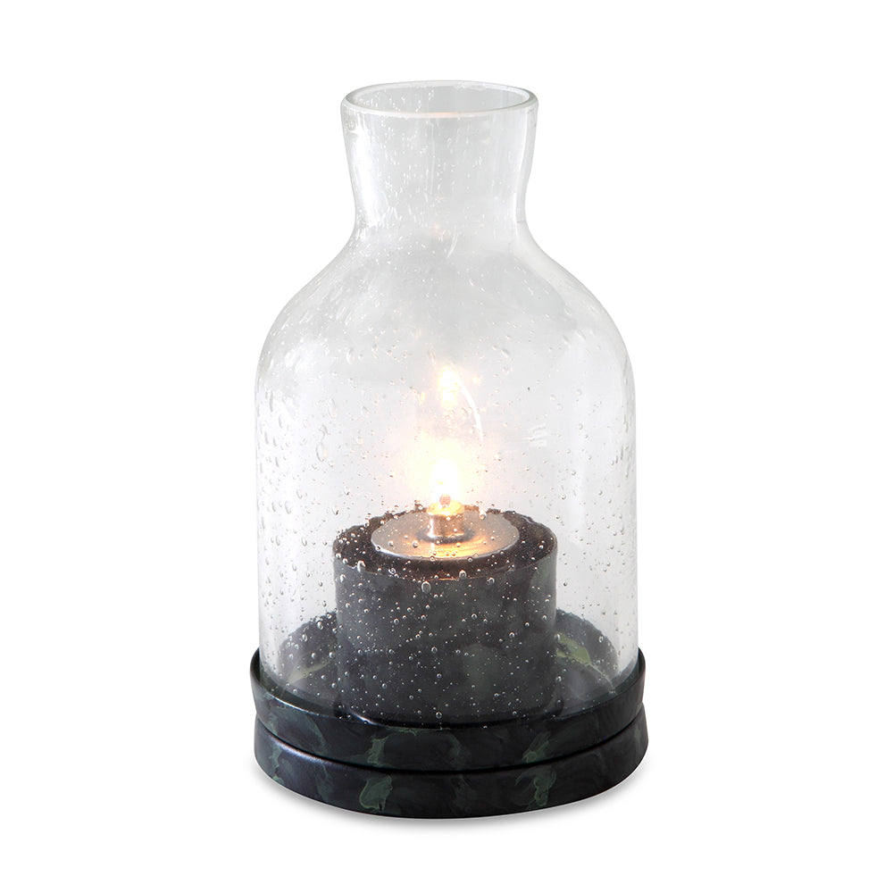A bottleneck glass lantern with authentic and rustic charm.