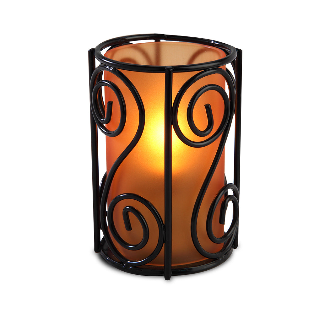 Swirl-detailed base holds a mini, frost cylinder for an artistic tabletop look.
