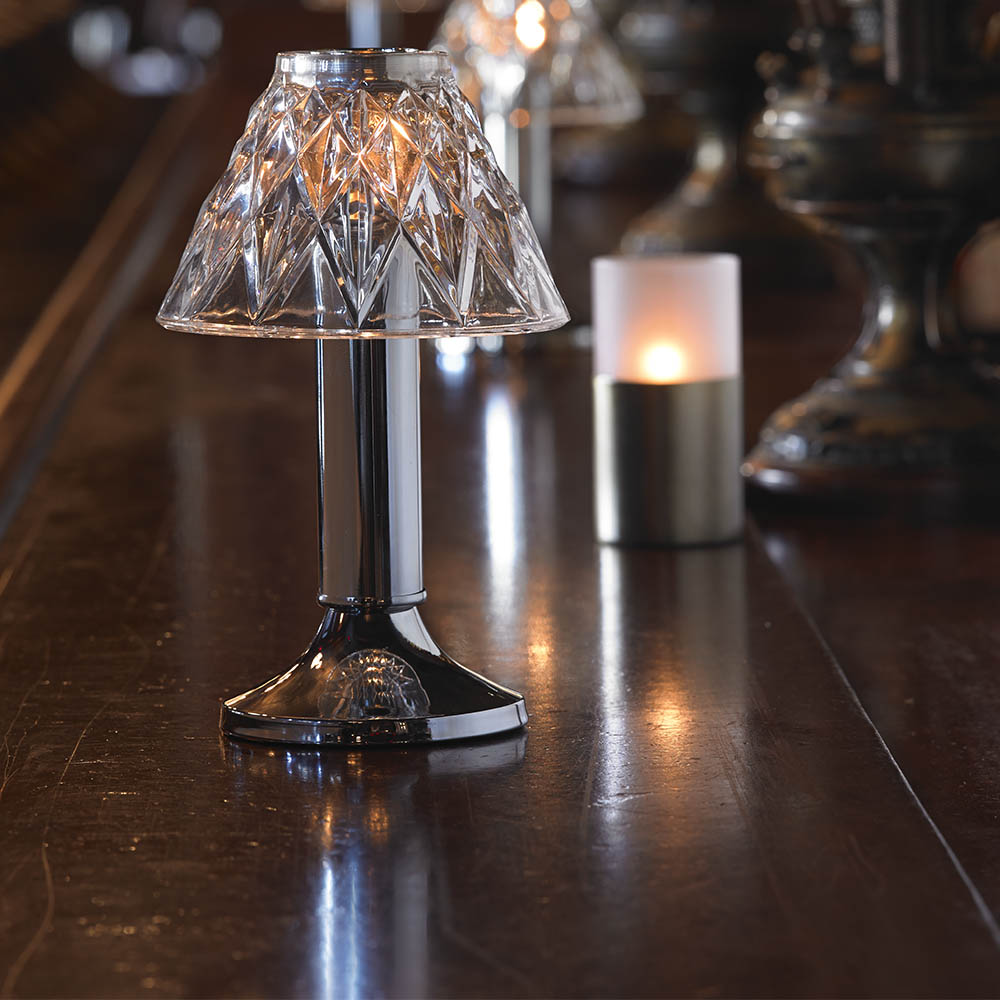 Polished metallic candlestick with textured glass shade offers an intimate glow to traditional settings.