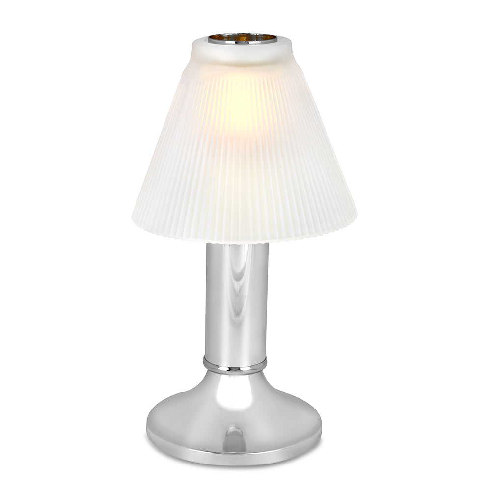 Polished metallic candlestick with textured glass shade offers an intimate glow to traditional settings.