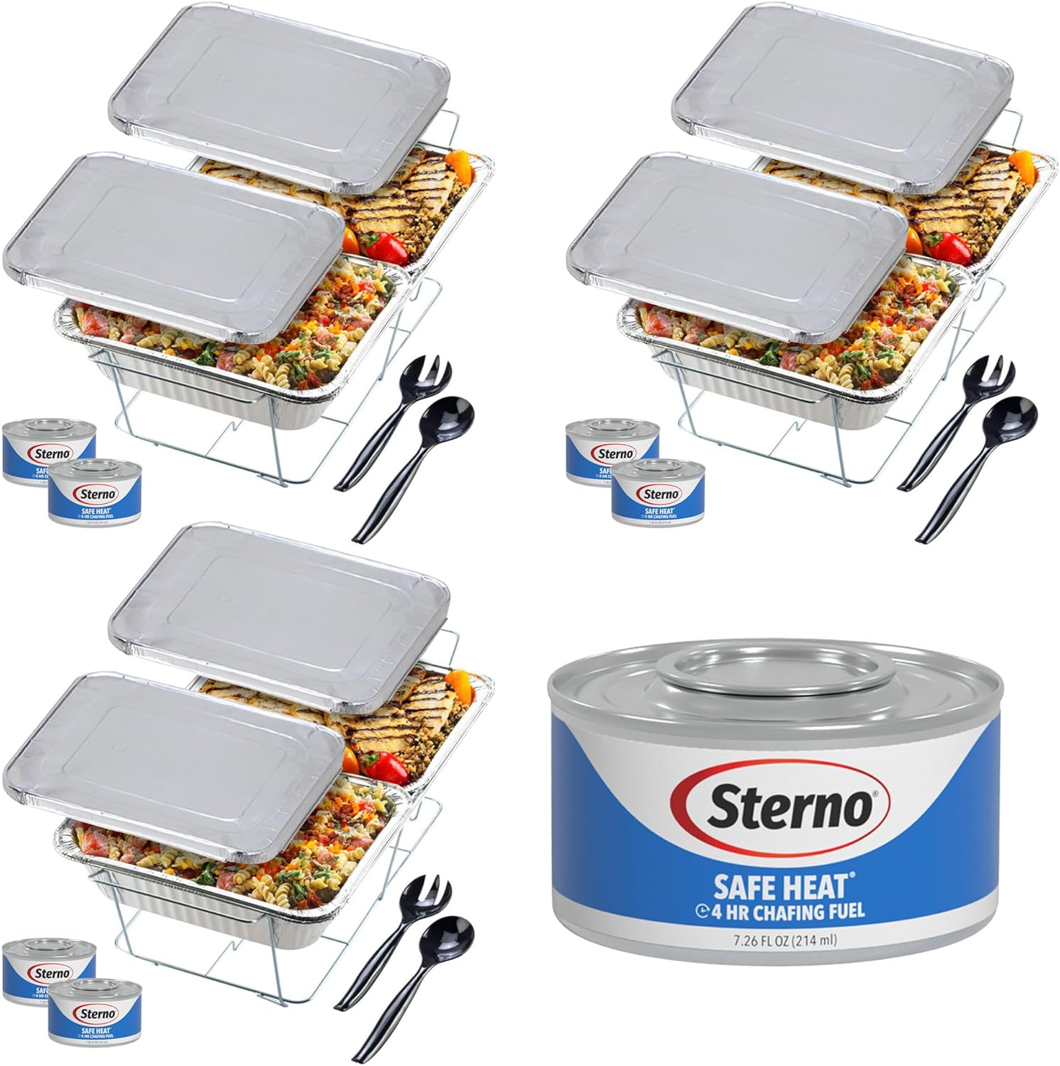 - Comprehensive 30-Piece Set: This all-in-one package includes 3 one-piece frames, 6 food pans, 3 water pans, 6 cans of 4-hour wick fuel, and essential serving utensils (forks and spoons), ensuring you have everything needed for efficient food service.